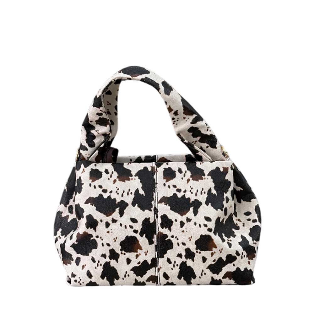 Bolso Adriana Vaca. Este modelo aporta frescura y originalidad en un solo accesorio. Este bolso con estampado de vaca en blanco y marrón es una declaración de estilo. Su diseño amplio y práctico lo hace ideal para el día a día, manteniéndote a la moda con un aire divertido y contemporáneo.