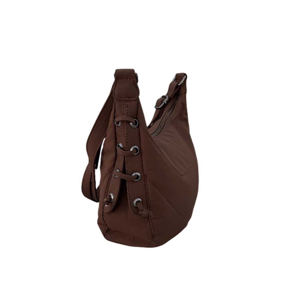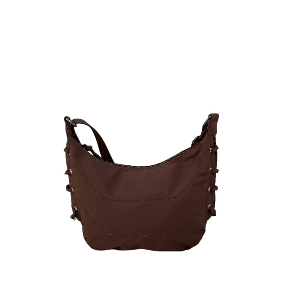 Bolso Choco Bandolera. Este bolso de gran capacidad en color marrón chocolate, fabricado en nylon, con asas dobles y detalles de ojales metálicos laterales será tu mejor aliado para el día a día por su tamaño y versatilidad.