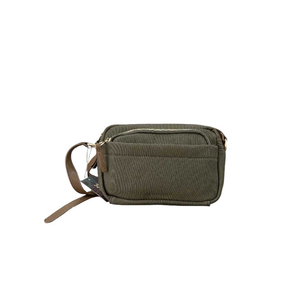 Bolso Terra Mini. Este modelo es tu aliado perfecto para esos días donde menos es más. Confeccionado en pana de alta calidad y un tono verde oliva que combina con todo, este bolso ofrece un look casual con un toque sofisticado. Cuenta con dos compartimentos principales con cierre de cremallera dorada, ideal para llevar lo esencial de manera segura. Su diseño ligero y su correa ajustable lo hacen cómodo para usar cruzado o al hombro.