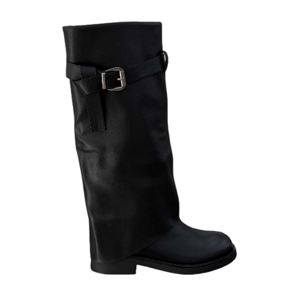 Bota Biker Negra. Bota plana estilo biker en color negro, perfecta para darle un toque diferente a tus looks sin perder comodidad. Cuenta con un detalle de hebilla en la zona superior de la caña y un cierre completo de cremallera. Ideales para los días de otoño-invierno. No te quedes sin ellas.