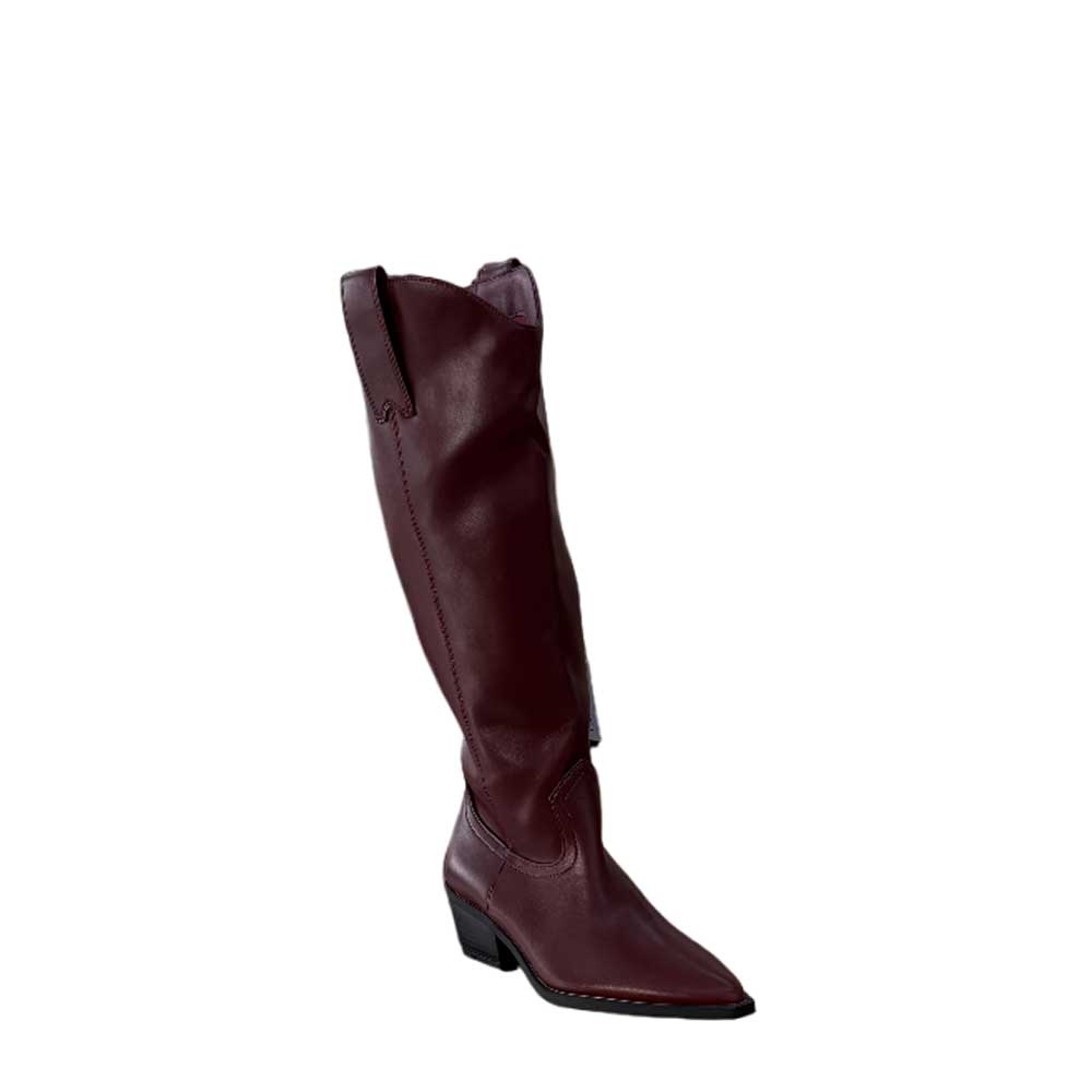 Botas Cowboy Cherry. Bota de estilo cowboy fabricada en polipiel. En coloro burdeos que le dará un toque de color divertido y diferente a tus looks. Cuenta con un cierre de cremallera en el lateral. Tiradores laterales decorativos y acabada en punta. Interior acolchado en caña y plantilla. Tacón y suela de goma antideslizante.