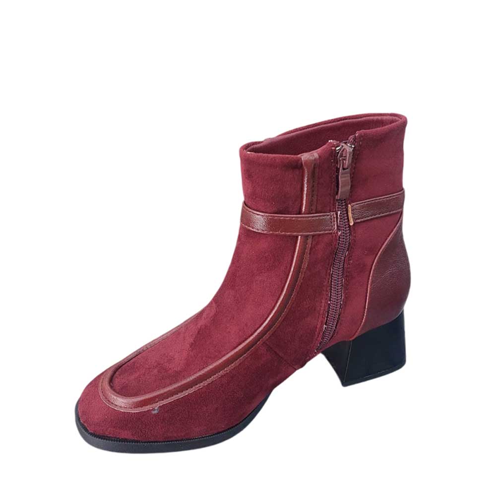 Botín Elle Burdeos, botín de antelina en color burdeos, de este modelo cabe destacar las líneas en material que decoran todo el botín, haciendo de él una línea moderna y fina. Con hebilla decorativa en un lateral y cremallera en el otro lateral. Suela de goma. Tacón medio y ancho, uno de los modelos más cómodos de la temporada.