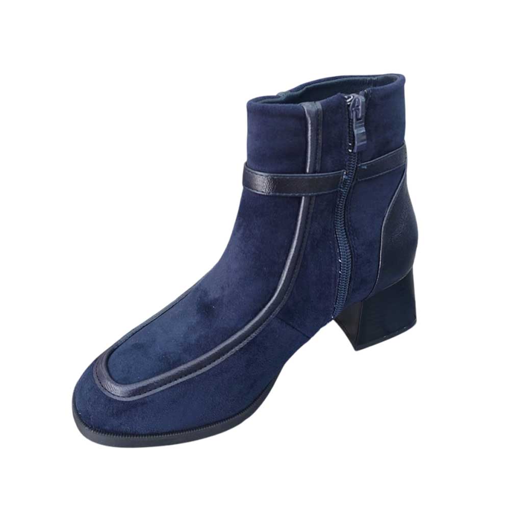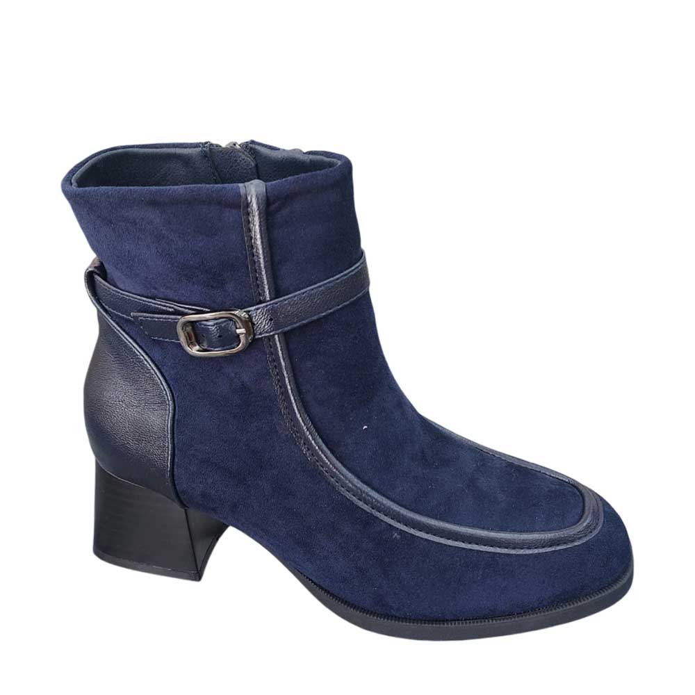 Botín Elle Marino, botín de antelina en color azul marino, de este modelo cabe destacar las líneas en material que decoran todo el botín, haciendo de él una línea moderna y fina. Con hebilla decorativa en un lateral y cremallera en el otro lateral. Suela de goma. Tacón medio y ancho, uno de los modelos más cómodos de la temporada.