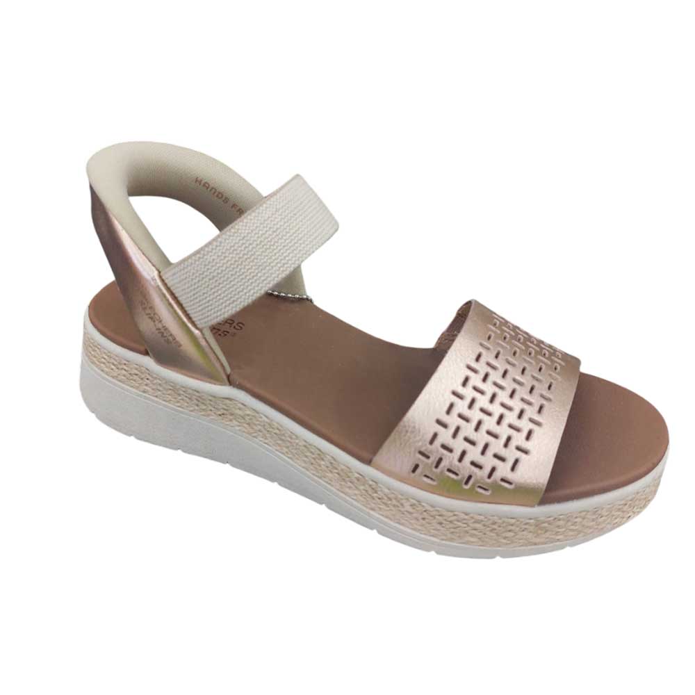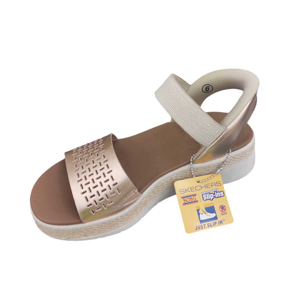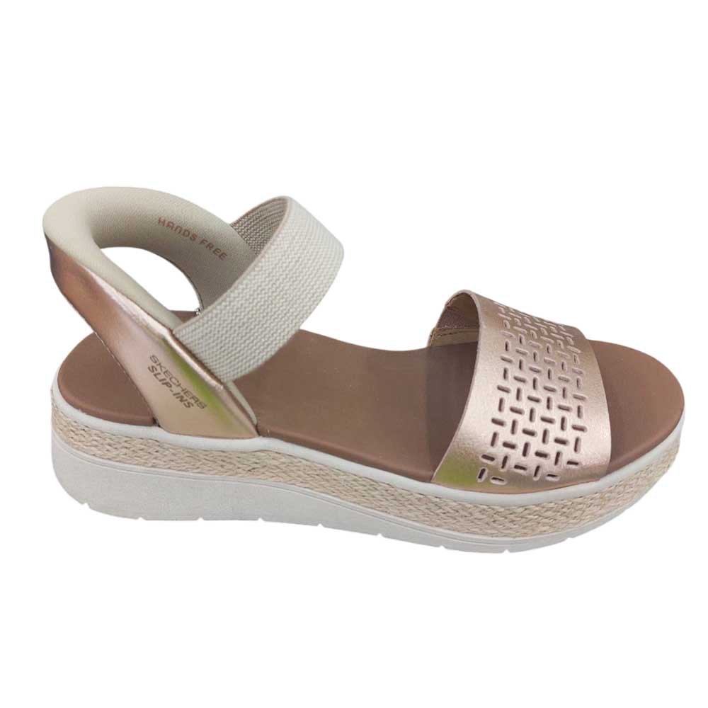 Skechers Bright Champagne, Luce un estilo alegre y relajado con este modelo. Esta sandalia sin cordones, diseñada con nuestro sistema exclusivo Slip-ins, se ponen sin necesidad de agacharse. Cuenta con una parte superior con tira de refuerzo en el empeine, ribete de yute en la media suela y una cómoda plantilla con amortiguación.