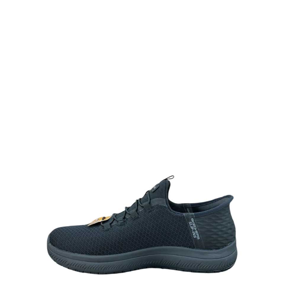 Skechers Work Slip-In Negras. Este modelo de Skechers hechas en material textil en color negro y con cordones elásticos, están especialmente diseñadas para el trabajo. Cuentan con un diseño ESD para minimizar la electricidad estática acumulada, además incluyen suela de tracción antideslizante y resistente al aceite de combustible, que también es ligera y flexible, con absorción de impacto. Cuenta con plantilla, Hi-Poly, EN ISO 20347:2012 y 01 FO SRC ESD.